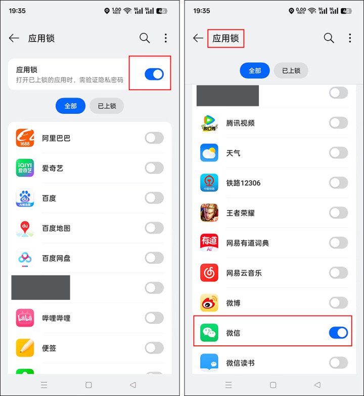 这个方法就是开启应用锁将微信锁起来,现在的手机基本上都是自带应用锁功能的,开启方法都很简单,在手机设置里就能直接开启。操作方法:点击手机桌面的【设置】-【隐私】-【应用锁】,将应用锁功能开启,然后再在底下的应用列表当中找到微信图标,将微信图标右边的开关打开,如此一来就可以把微信锁起来了。每次进入微信,就都需要输入应用锁密码才能进入,不知道你应用锁密码的人,也就没法偷看到你微信的聊天内容和打你微信钱的注意啦。