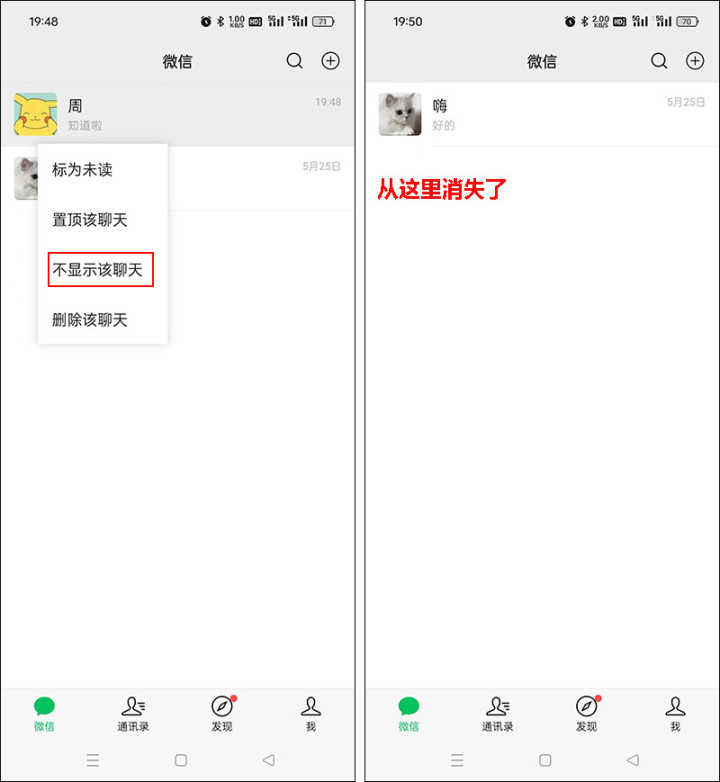 操作方法:长按你想隐藏的好友的聊天窗口,然后点击【不显示该聊天】,这样该好友就会从你的最近聊天列表里消失,隐藏到微信通讯录里去,并且大家放心,通过这个方法隐藏好友微信聊天记录依然会在,不会被删掉。该好友不在最近聊天的列表那,也就不用担心别人不经意的瞄一眼你的手机就发现你跟对方聊过天,也没法瞄到你跟对方的聊天记录内容了,妥妥的放心。